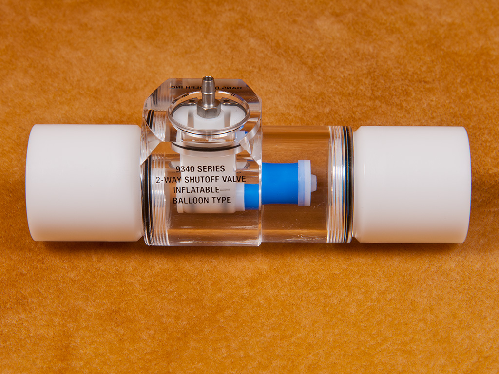 Two-Way Shutoff™ Inflatable Balloon-Type valves function as an open/close type flow control valve with a "straight thru" flow path configuration. A replaceable silicone rubber inflatable balloon is mounted in the valve flow path for open/close control of the flow.